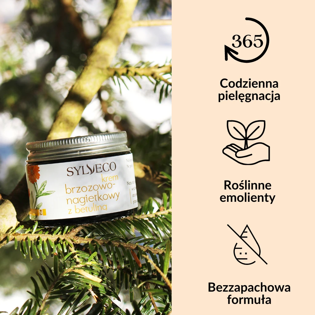 krem na dzień: olej z pestek winogron, oliwę z oliwek, skwalan roślinny, betulina, witamina B3
